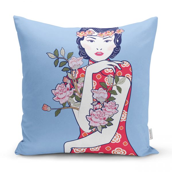 Çiçeğe Sarılmış Japon Kız Motifli Dekoratif Kırlent Kılıfı