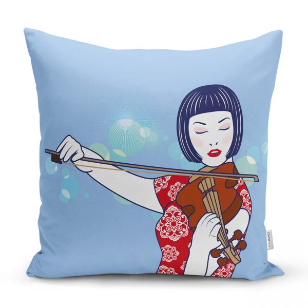 Mavi Zeminde Keman Çalan Japon Kız Desenli Dekoratif Kırlent Kılıfı