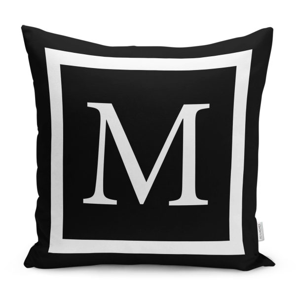 Siyah Zemin Beyaz Çerçeveli M Harfi Dijital Baskılı Kırlent Kılıfı