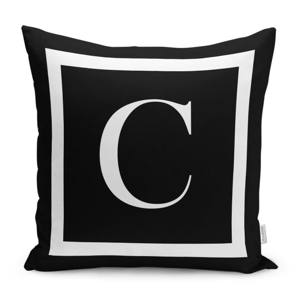 Siyah Zemin Beyaz Çerçeveli C Harfi Dijital Baskılı Kırlent Kılıfı