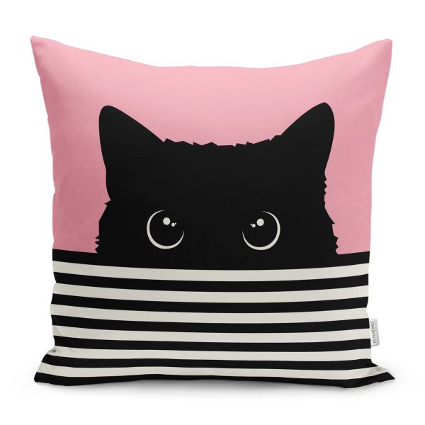 Pembe Zemin Çizgili Motif Kara Kedi Tasarımlı Modern Yastık Kırlent Kılıfı