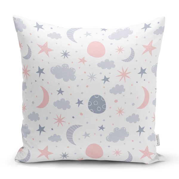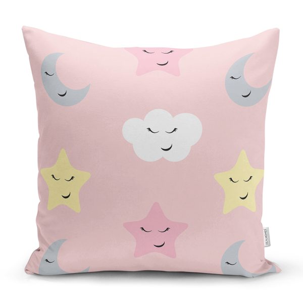 Pembe Zeminli Ay Ve Yıldız Desenli Dijital Baskılı Özel Tasarım Modern Yastık Kırlent Kılıfı