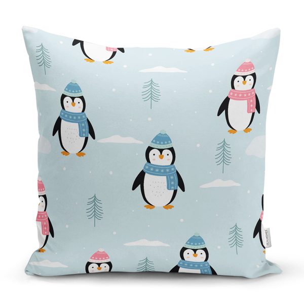Atkılı Penguen Desenli Dijital Baskılı Özel Tasarım Modern Yastık Kırlent Kılıfı