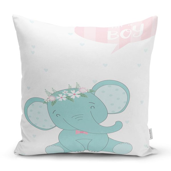 Beyaz Zeminde Sevimli Fil Desenli Dijital Baskılı Çocuk Odası Yastık Kırlent Kılıfı