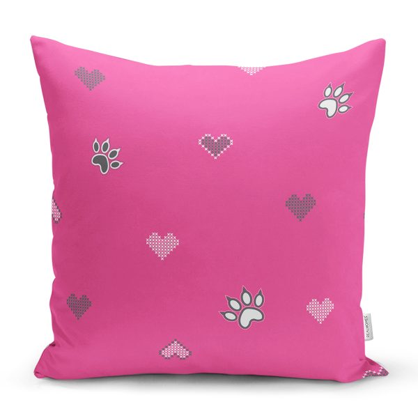 Pembe Zeminli Kalp ve Pati İzleri Modern Yastık Kırlent Kılıfı