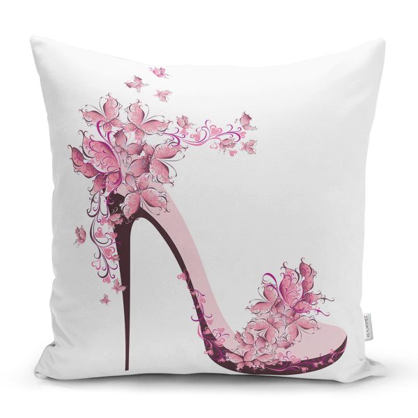 Pembe Çiçekli Topuklu Ayakkabı İllüstrasyon Dijital Baskılı Dekoratif Yastık Kırlent Kılıfı
