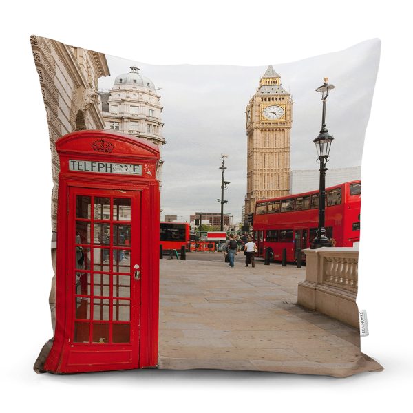 Kırmızı Telefon Kulübesi Tasarımlı Dijital Baskılı Dekoratif Yastık Kırlent Kılıfı