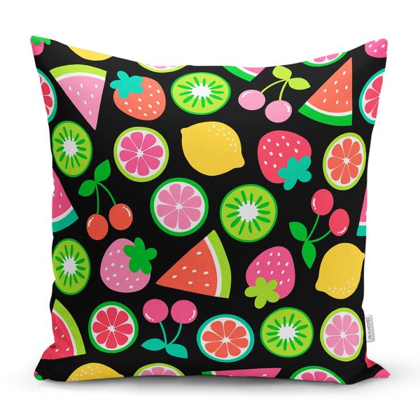 Siyah Zeminli Meyveler Tasarımlı Dijital Baskılı Modern Yastık Kırlent Kılıfı