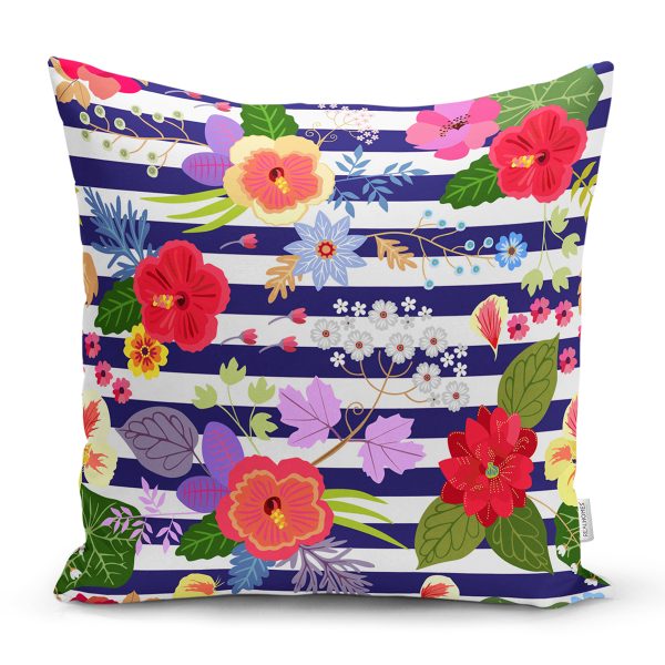 Mavi Çizgili Çiçek Desenli Özel Tasarım Dijital Baskılı Modern Yastık Kırlent Kılıfı