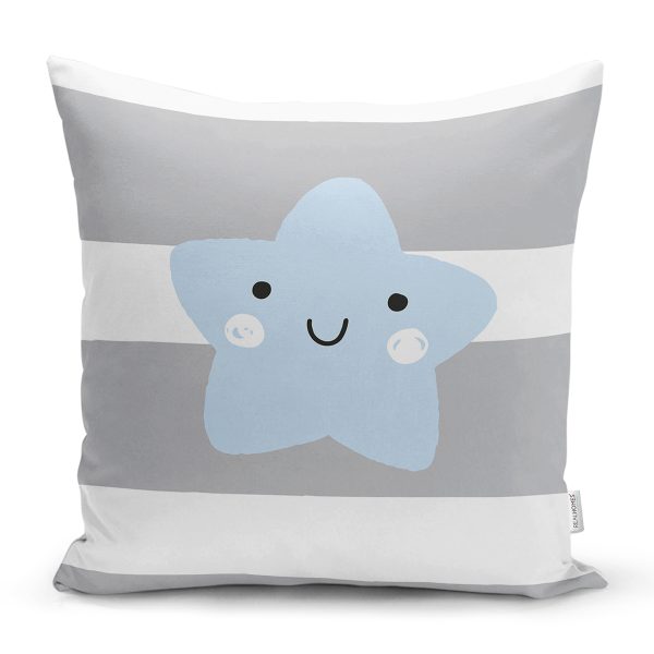 Realhomes Gri Çizgiler Üzerine Mavi Yıldız Tasarımlı Modern Yastık Kırlent Kılıfı