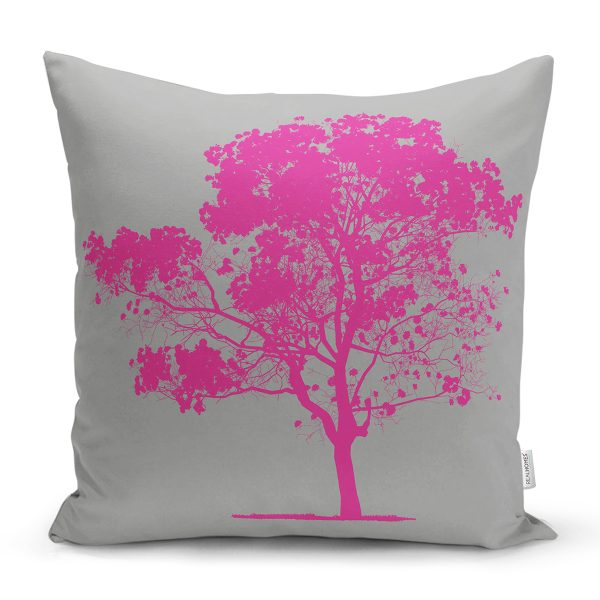 Gri Zeminde Dekoratif Fuşya Ağaç Tasarımlı Kırlent Kılıfı