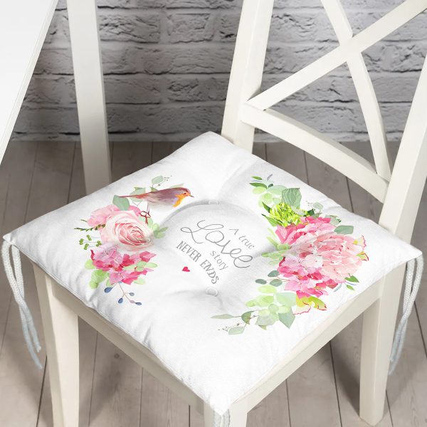 Kuş Motifli A True Love Story Never Ends Renkli Modern Pofuduk Sandalye Minderi