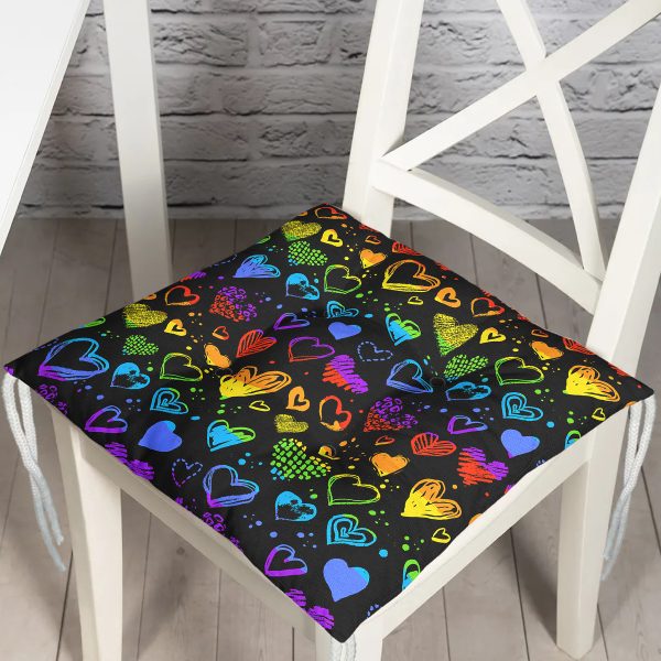 Rengarenk Kalp Desenli Özel Tasarım Dijital Baskılı Modern Pofuduk Sandalye Minderi