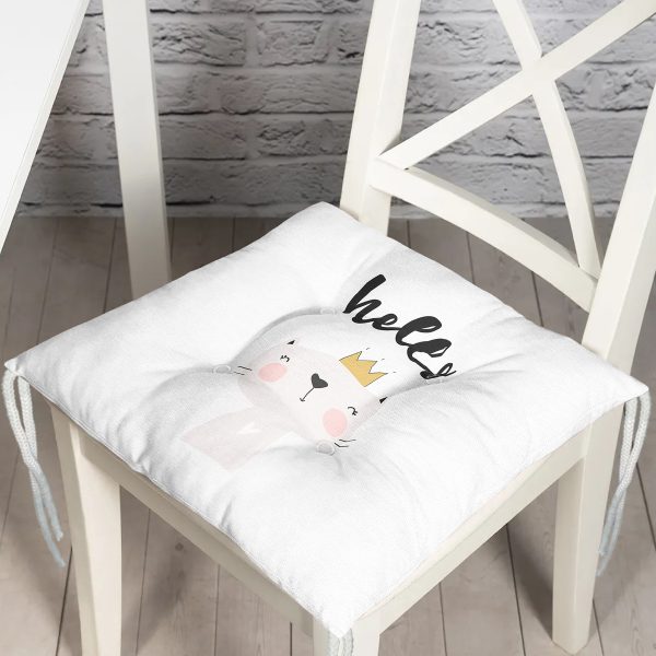 Beyaz Zeminde Hello Kedicik Özel Tasarımlı Modern Pofuduk Sandalye Minderi