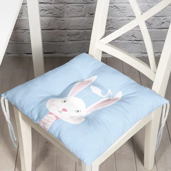 Mavi Zemin Sevimli Tavşan Ve Leylek Desenli Dijital Baskılı Çocuk Odası Pofuduk Sandalye Minderi