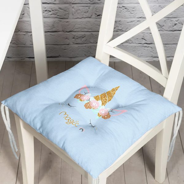 Mavi Zeminde Magic Yazılı Unicorn Desenli Dijital Baskılı Çocuk Odası Pofuduk Sandalye Minderi