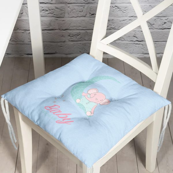 Mavi Zeminde Baby Shower Temalı Fil Desenli Dijital Baskılı Çocuk Odası Pofuduk Sandalye Minderi