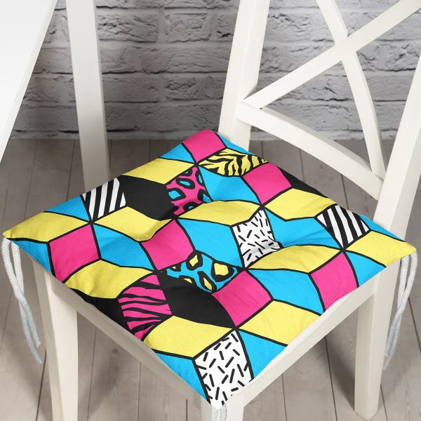 Renkli Zemin Üzerinde Modern Geometrik Küp Desenli Dijital Baskılı Modern Pofuduk Sandalye Minderi