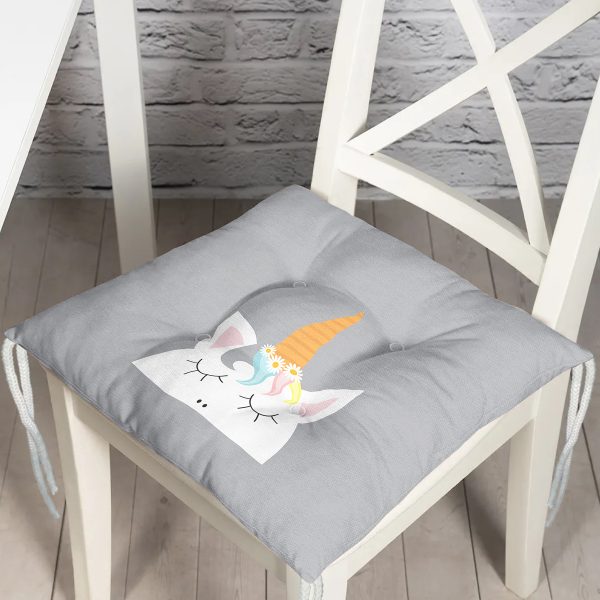 Gri Zeminde Unicorn Desenli Tasarımlı Dijital Baskılı Çocuk Odası Pofuduk Sandalye Minderi