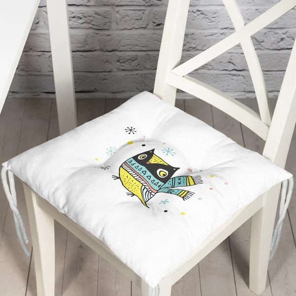 Realhomes Beyaz Zeminde Atkılı Baykuş Desenli Modern Pofuduk Sandalye Minderi