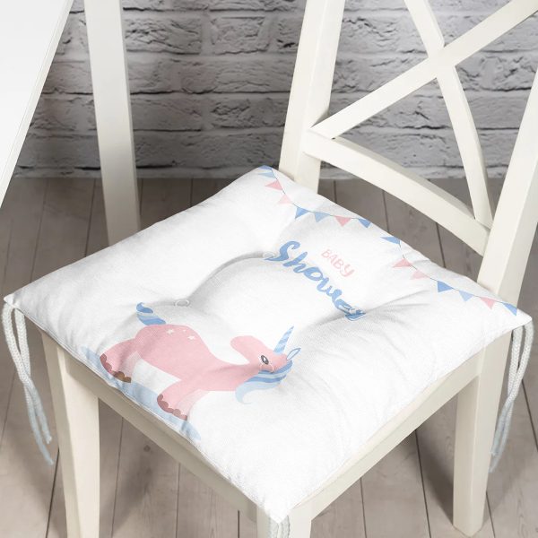 Beyaz Zemin Baby Shower Yazılı Unicorn Desenli Dijital Baskılı Çocuk Odası Pofuduk Sandalye Minderi