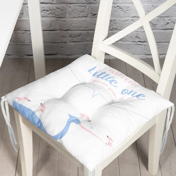 Beyaz Zemin Pelikan Ve Kuş Desenli Özel Tasarımlı Dijital Baskılı Çocuk Odası Pofuduk Sandalye Minderi