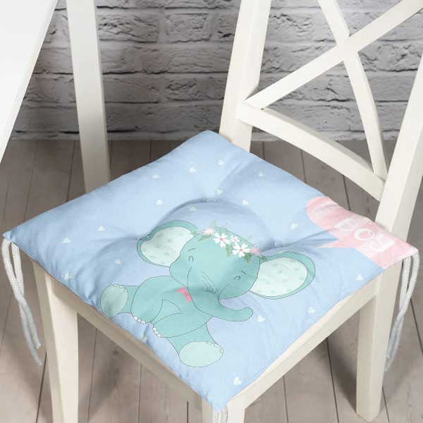 Mavi Zeminde Sevimli Fil Desenli Dijital Baskılı Çocuk Odası Pofuduk Sandalye Minderi