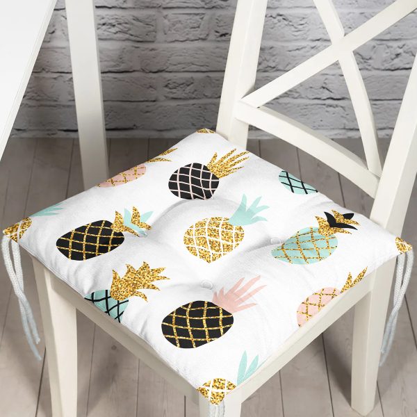 Beyaz Zemin Üzerinde Gold Detaylı Ananas Desenli Dijital Baskılı Modern Pofuduk Sandalye Minderi