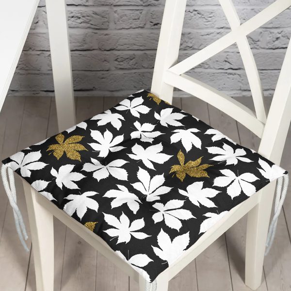 Siyah Zemin Üzerinde Gold Detaylı Beyaz Çiçek Desenli Dijital Baskılı Modern Pofuduk Sandalye Minderi