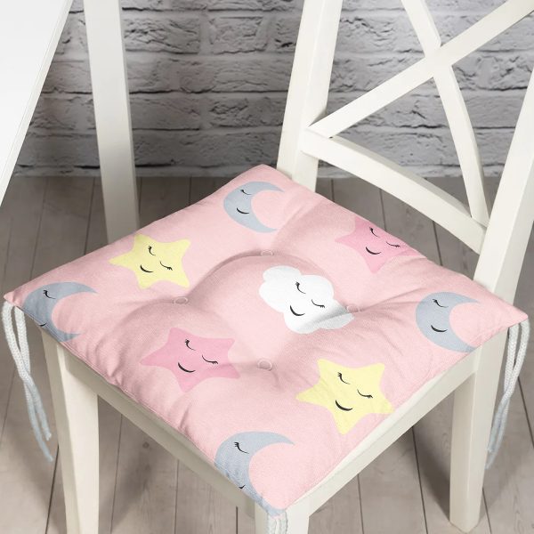 Pembe Zeminli Ay Ve Yıldız Desenli Dijital Baskılı Özel Tasarım Modern Pofuduk Sandalye Minderi