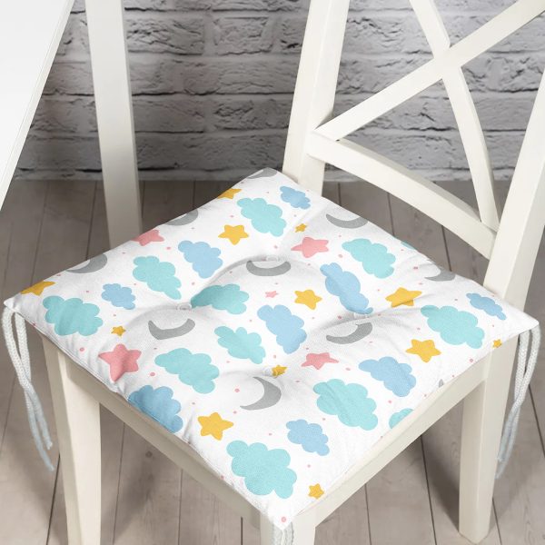 Beyaz Zeminli Bulut Ve Ay Desenli Dijital Baskılı Özel Tasarım Modern Pofuduk Sandalye Minderi