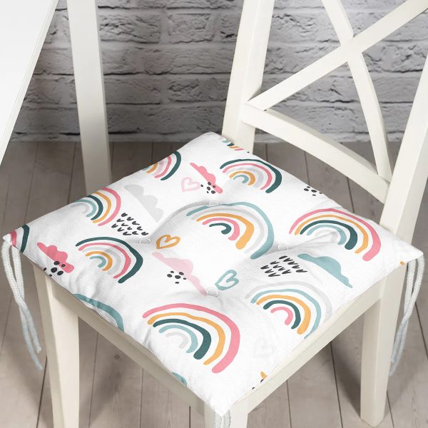 Gökkuşağı Kalp Ve Bulut Motifli Dijital Baskılı Özel Tasarım Modern Pofuduk Sandalye Minderi