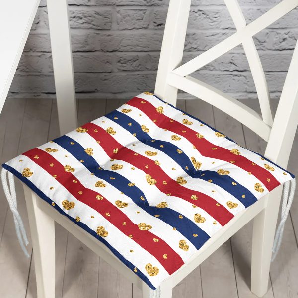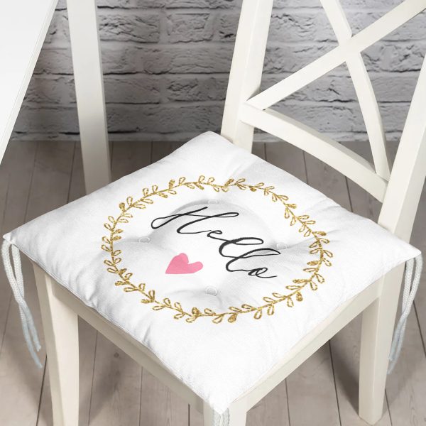 Beyaz Zemin Üzerinde Gold Detaylı Kalp Desenli Dijital Baskılı Modern Pofuduk Sandalye Minderi