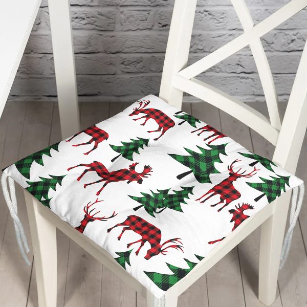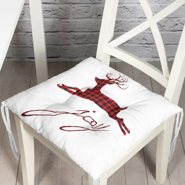 Beyaz Zemin Üzerinde Çam Ağaçlı Ekoseli Geyik Motifli Dijital Baskılı Modern Pofuduk Sandalye Minderi