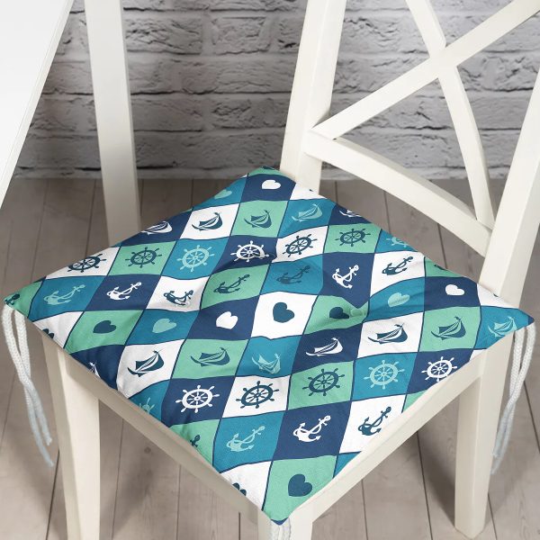Denizci Temalı Çapa Dümen Gemi Figürlü Özel Tasarım Dijital Baskılı Modern Pofuduk Sandalye Minderi