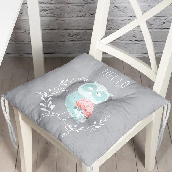 Gri Zemin Sevimli Baykuş Desenli Özel Tasarımlı Dijital Baskılı Modern Pofuduk Sandalye Minderi