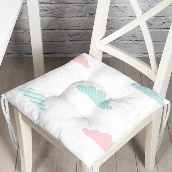 Beyaz Zemin Pembe Mavi Bulut Desenli Dijital Baskılı Çocuk Odası Pofuduk Sandalye Minderi
