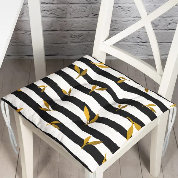 Beyaz Zemin Üzerinde Siyah Çizgili Gold Detay Yapraklı Dijital Baskılı Modern Pofuduk Sandalye Minderi