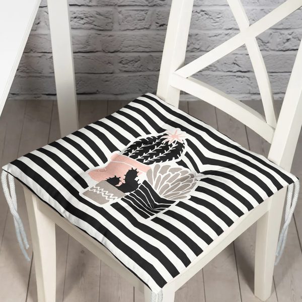 Renkli Zemin Üzerinde Siyah Çizgili Kaktüs Desenli Dijital Baskılı Modern Pofuduk Sandalye Minderi
