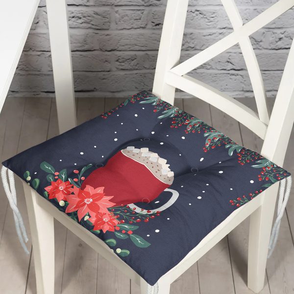 Lacivert Zemin Kırmızı Bardak Desenli Dijital Baskılı Modern Pofuduk Sandalye Minderi