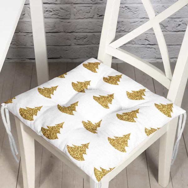 Beyaz Zeminde Gold Renkli Çam Ağacı Desenli Dijital Baskılı Modern Pofuduk Sandalye Minderi