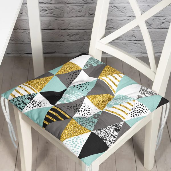 Pastel Zemin Üzerinde Gold Detaylı Geometrik Desenli Dijital Baskılı Modern Pofuduk Sandalye Minderi