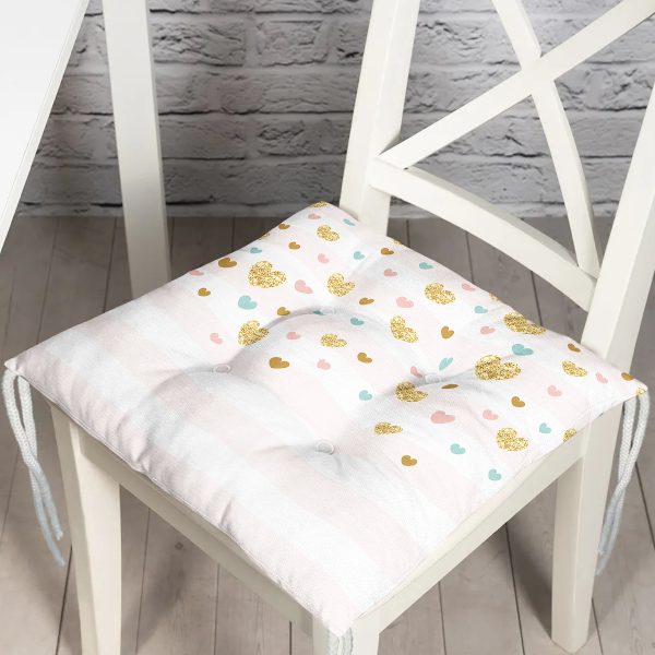 Beyaz Zeminde Pembe Yatay Çizgili Gold Detaylı Kalp Desenli Dijital Baskılı Modern Pofuduk Sandalye Minderi