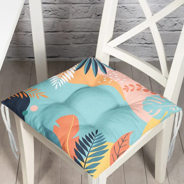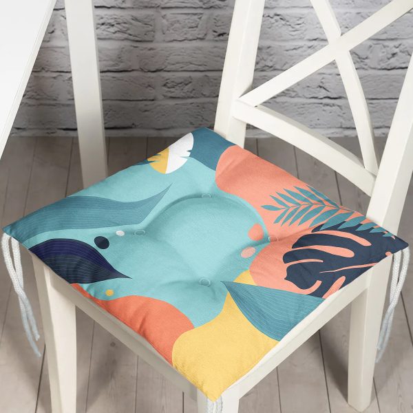 Renkli Zemin Üzerinde Pastel Yaprak Desenli Dijital Baskılı Modern Pofuduk Sandalye Minderi