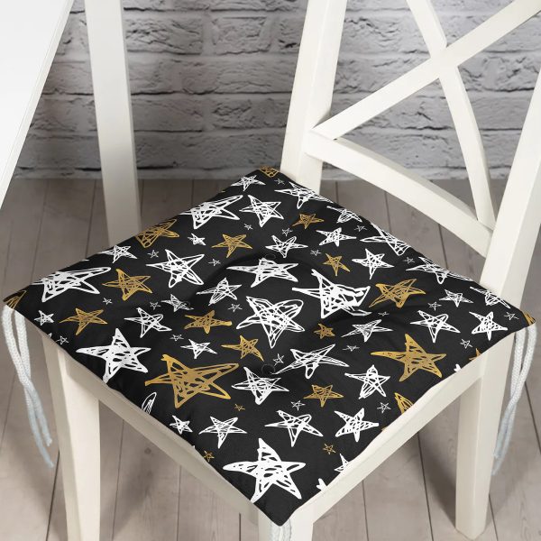 Siyah Zemin Üzerinde Gold Detaylı Beyaz Yıldız Desenli Dijital Baskılı Modern Pofuduk Sandalye Minderi