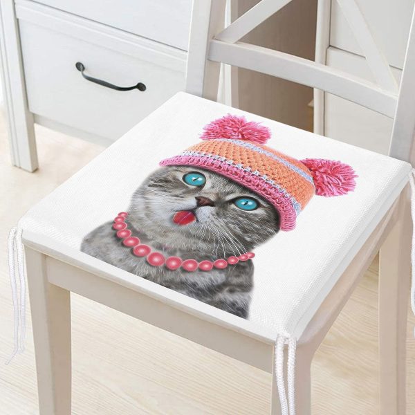 Şapkalı Mavi Gözlü Sevimli Kedi Dijital Baskılı Fermuarlı Sandalye Minderi