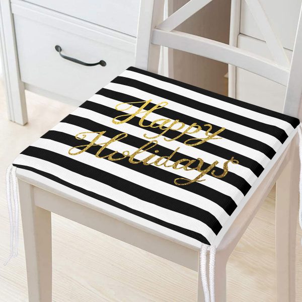 Beyaz Zeminde Siyah Çizgili Gold Yazılı Happy Holidays Yazılı Dijital Baskılı Modern Fermuarlı Sandalye Minderi