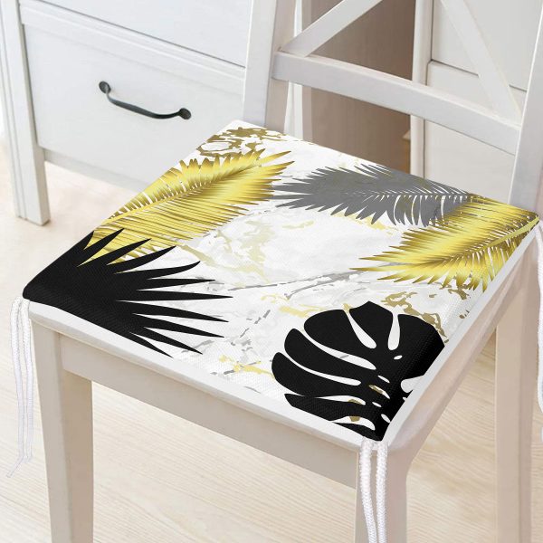 Mermer Zeminli Gold Ve Siyah Yapraklar Dijital Baskılı Modern Fermuarlı Sandalye Minderi
