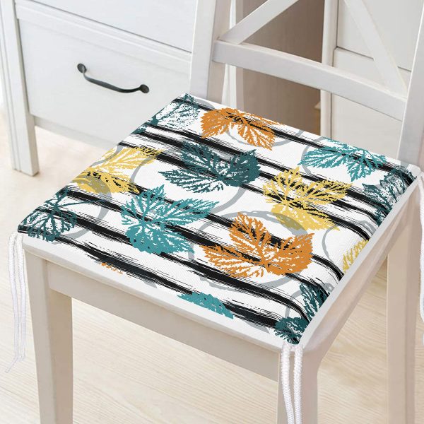 Beyaz Zeminde Siyah Çizgili Renkli Yaprak Desenli Dijital Baskılı Modern Fermuarlı Sandalye Minderi