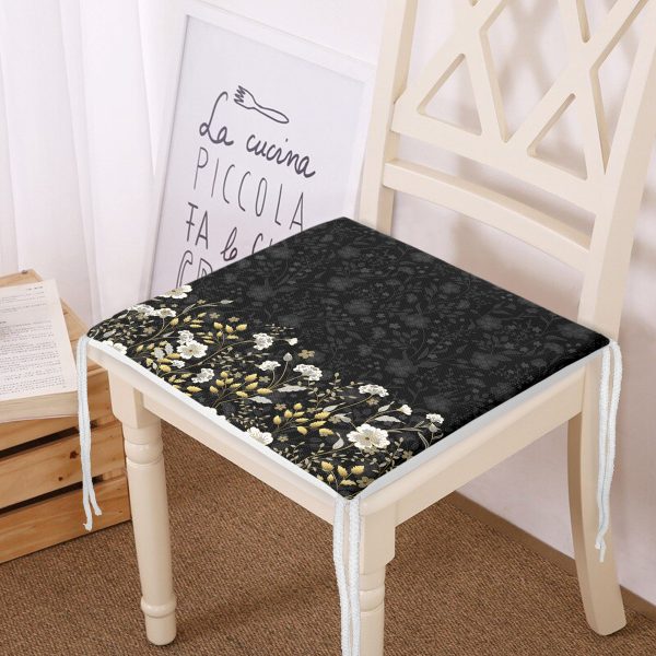 Siyah Zemin Üzerinde Gold Detaylı Çiçek Desenli Dijital Baskılı Modern Fermuarlı Sandalye Minderi